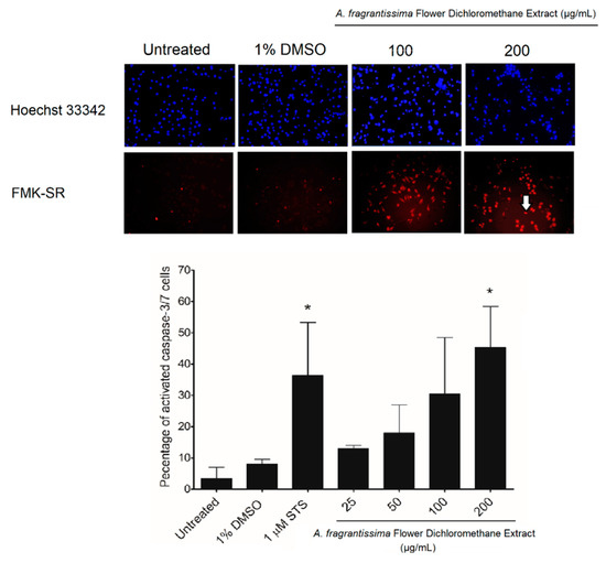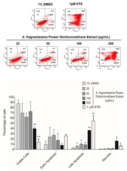 Furthermore, additional confirmatory experiments were required to confirm apoptosis as the main mechanism of cell death [39]. Further experiments in this study include the observation of apoptosis-related cell morphological changes, the detection of caspase-3/7 activation, and abnormal exposure of phosphatidylserine on the outer cell membrane in treated MDA-MB-231 cells. The treatment of MDA-MB-231 cells with A. fragrantissima flower dichloromethane extract clearly led to a gradual increase in cell shrinkage, in a dose-dependent manner, with the highest concentrations (i.e., 100 and 200 µg/mL) displaying similar observations as the apoptosis inducer, STS, used as a positive control. For caspase-3/7 activation, the detection was based on the fluorescent inhibitor of caspases (FLICA) methodology. The method was based on the covalent binding of fluoromethyl ketone (FMK) moiety to the center of the activated caspase by a recognition sequence for capase-3/7 (i.e., aspartic acid–glutamic acid–valine–aspartic acid) [40]. The FLICA method allowed direct visualization of activated caspase-3/7 in treated MDA-MB-231 cells as red-fluorescence cells while cells without activated caspases display the nucleus only after use of the Hoechst 33342 (blue) staining. The A. fragrantissima flower dichloromethane extract clearly increased the number of activated caspase-3/7 cells to levels comparable to the protein kinase inhibitor, STS. The FACS analysis using the fluorescein isothiocyanate (FITC)-labeled Annexin V/phycoerythrin (PE)-labeled PI dual staining allowed the detection of viable, early apoptosis, late apoptosis, and dead/necrotic cell populations in MDA-MB-231 cells treated with STS or different A. fragrantissima extract concentrations. The experiment confirmed the occurrence of the early and late apoptotic status by Annexin V binding to the exposed phosphatidylserine on the outer leaf of the cell membrane, which is a hallmark characterization of programmed cell death [41]. Furthermore, the PI binding to nucleic acids is used to detect cells with lost cell membrane integrity as seen in late apoptotic and dead/necrotic cell populations, which is also considered an irreversible cell death status [42].