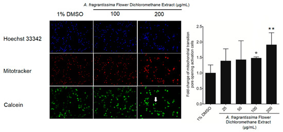 After confirming that caspase-dependent apoptosis as a cell death mechanism occurred in the MDA-MB-231 cells exposed to A. fragrantissima flower dichloromethane extract, a deeper investigation was conducted to determine the involvement of the intrinsic apoptosis pathway using the mitochondrial permeability transition pore activation assay. Indeed, apoptosis occurs in two pathways referred to as intrinsic and extrinsic. The intrinsic apoptosis pathway involves mitochondrial permeability transmembrane pore opening forming the apoptosome leading to caspase-9 activation, then subsequently to executioner caspases-3/7 activation [43]. The bioassay directly measured the mitochondrial permeability transition pore opening activity using acetoxymethyl ester of calcein dye, which accumulated in the cytosolic compartments and liberated into a highly-fluorescent calcein. In pro-apoptotic conditions, the cells with activated mitochondrial permeability transition pore opening appeared brightly green due to the redistribution of calcein from the cytosol into the mitochondria. The addition of the quencher, CoCl2, removed the remaining cytosolic fluorescence, while the mitochondrial fluorescence was maintained visible under the confocal microscopy. The treatment of MDA-MB-231 cells with A. fragrantissima flower dichloromethane extract increased the number of cells displaying activated mitochondrial permeability transition pore opening in a dose-dependent manner, confirming the involvement of the mitochondria-dependent intrinsic apoptosis pathway. Interestingly, our findings characterizing the main hallmarks of apoptosis, including caspase-3/7 detection, apoptosis status determination by FACS, and mitochondrial membrane transition pore opening activation, exhibited a similar pattern. The results clearly displayed an induction of apoptosis in TNBC MDA-MB-231 cells, which slightly and gradually increased in response to the 25 and 50 µg/mL treatment to reach the highest pro-apoptotic changes in response to 100 and 200 µg/mL of A. fragrantissima flower dichloromethane extract.