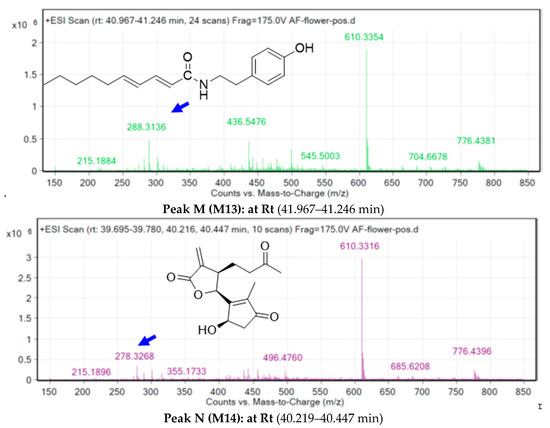 The method of separation and identification of A. fragrantissima flower metabolites in dichloromethane extract was performed using an Agilent (Santa Clara, CA, USA) 1260 Infinity HPLC system coupled to Agilent 6530 quadrupole time-of-flight (Q-TOF) as described earlier in [69]. Briefly, the separation was performed using an Agilent SB-C18 column (4.6 mm × 150 mm, 1.8 μm) with the following elution gradient; 0 to 2 min, 5% B; 2 to 17 min, 5 to 100% B; 17 to 21 min, 95% B; 21 to 25 min, 5% B, using mobile-phase A (0.1% formic acid in water) and mobile-phase B (0.1% formic acid in methanol). The flow rate was set at 250 μL/min and injection volume was 10 μL. The scanning range was set at 50–800 (m/z), gas temperature at 300 °C gas flow of 8 L/min, nebulizer pressure of 35 psi, sheath gas temperature at 350 °C, and sheath gas flow rate of 11 L/min. The data were generated by the Agilent MassHunter (version B. 06.00) qualitative analysis software.
