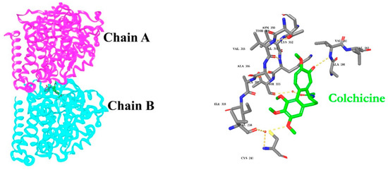 The fourteen identified metabolites from A. fragrantissima flower dichloromethane extract were docked into Tubulin [30,31,32] and Carbonic anhydrase (CA) IX enzyme [33,34], two main substrates reported to be inhibited by flavonoids, to investigate the molecular interactions using Maestro Schrödinger software. The crystal structures of Tubulin and CA IX enzyme were optimized and minimized, followed by grid generations for both binding pockets. For Tubulin docking, Colchicine (native ligand) was used as a positive control and the docking protocol was validated by docking the Colchicine into the binding site with a low root-mean-square deviation (RMSD) value relative to crystal structure. The docking scores for the fourteen identified metabolites range from −4.23 to −9.89 kcal/mol. As shown in Table 4, metabolite 11 (M11, Quercetin) demonstrated the highest docking score (−9.89 kcal/mol), followed by M1 (Cosmosiin, −9.59 kcal/mol) and M2 (Centaureidin, −9.16 kcal/mol). Moreover, M11 exhibited several interactions with the binding site including Cys241, Val181, and Asn350, and occupied a similar binding pose relative to Colchicine as illustrated in Figure 8. All the 2-D interaction maps for the metabolites with Tubulin are presented in Figure 8.