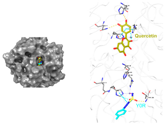 An additional molecular docking study was performed to assess the possibility of the identified metabolites including flavonoids, to bind and inhibit Tubulin [30,31,32] and CA IX enzyme [33,34]. The selection of these two targets was based on the previously reported in vitro studies that confirmed the inhibition by flavonoids, particularly, Quercetin. It is worth noting that the CA IX enzyme is highly expressed in the TNBC MDA-MB-231 cell line, which is reported to contribute to the aggressiveness and dysfunction of this type of cancer [51,52,53]. Our docking results were consistent with the previously reported studies in which Metabolite 11 (M11, Quercetin) possesses the highest docking score among the other metabolites against the two targets, suggesting the validity of the protein selection. Moreover, it has been demonstrated by several studies that inhibition of Tubulin polymerization and CA IX enzyme serve as a new and novel mechanism for promising anticancer activity [54,55,56,57,58,59,60,61,62].