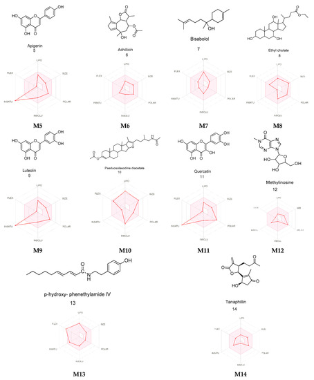 Several pharmaceutical properties important for drug discovery were calculated for the identified metabolites using the SwissADME web server and QikProp tool. These parameters include Molecular Weight (g/mol), Log Po/w (lipophilicity), Log S (solubility), blood–brain barrier (BBB) Permeability, and gastrointestinal (GI) Absorption. As shown in Table 6, all the metabolites exhibited acceptable pharmaceutical parameters (Figure 10) that were within Lipinski’s rule of five (ROF), except for metabolites M1 and M10 that violated the hydrogen bond donor/acceptor rule and molecular weight, respectively. Moreover, most of the metabolites were predicted to act peripherally with no central nervous system effects, except for M6, M7, and M13. Additionally, the majority of the identified metabolites were predicted to possess a high GI absorption, except for M1 and M12.