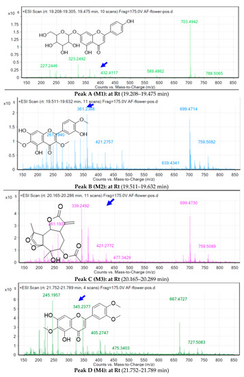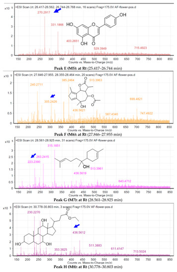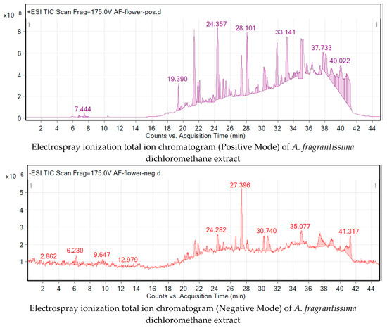 The method of separation and identification of A. fragrantissima flower metabolites in dichloromethane extract was performed using an Agilent (Santa Clara, CA, USA) 1260 Infinity HPLC system coupled to Agilent 6530 quadrupole time-of-flight (Q-TOF) as described earlier in [69]. Briefly, the separation was performed using an Agilent SB-C18 column (4.6 mm × 150 mm, 1.8 μm) with the following elution gradient; 0 to 2 min, 5% B; 2 to 17 min, 5 to 100% B; 17 to 21 min, 95% B; 21 to 25 min, 5% B, using mobile-phase A (0.1% formic acid in water) and mobile-phase B (0.1% formic acid in methanol). The flow rate was set at 250 μL/min and injection volume was 10 μL. The scanning range was set at 50–800 (m/z), gas temperature at 300 °C gas flow of 8 L/min, nebulizer pressure of 35 psi, sheath gas temperature at 350 °C, and sheath gas flow rate of 11 L/min. The data were generated by the Agilent MassHunter (version B. 06.00) qualitative analysis software.