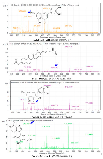 The crude extract of the A. fragrantissima flower dichloromethane was subjected to total ion current (TIC) spectra raw data and the data analysis program MassHunter (Agilent Technologies) qualitative and quantitative analysis software was used. After conducting a mass screening on the below spectrum, chemical features were extracted from the liquid chromatography–mass spectrometry (LC-MS) data using the Molecular Features Extraction (MFE) algorithm and the recursive analysis workflow (Figure 7). Features were extracted by screening the detected nodes at various retention times (Rt) per minute, with a minimum intensity of 6000 counts, and aligned with previously detected compounds considering adducts ([M + K]+, and [M − H]−). Cosmosiin [21], Centaureidin [22], Apressin [22], Eupatilin [23], Lupeol [17], Oleic acid [24], Bisabolol, [22], Ethyl isoallocholate [25], Luteolin [26], Pseduosolasodine diacetate [25], Quercetin [27], Methylinosine [25], p-hydroxy-phenethylamine IV [28], and Tanaphillin, [29], Means m/z implies measured m/z.