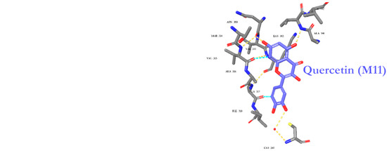 The fourteen identified metabolites from A. fragrantissima flower dichloromethane extract were docked into Tubulin [30,31,32] and Carbonic anhydrase (CA) IX enzyme [33,34], two main substrates reported to be inhibited by flavonoids, to investigate the molecular interactions using Maestro Schrödinger software. The crystal structures of Tubulin and CA IX enzyme were optimized and minimized, followed by grid generations for both binding pockets. For Tubulin docking, Colchicine (native ligand) was used as a positive control and the docking protocol was validated by docking the Colchicine into the binding site with a low root-mean-square deviation (RMSD) value relative to crystal structure. The docking scores for the fourteen identified metabolites range from −4.23 to −9.89 kcal/mol. As shown in Table 4, metabolite 11 (M11, Quercetin) demonstrated the highest docking score (−9.89 kcal/mol), followed by M1 (Cosmosiin, −9.59 kcal/mol) and M2 (Centaureidin, −9.16 kcal/mol). Moreover, M11 exhibited several interactions with the binding site including Cys241, Val181, and Asn350, and occupied a similar binding pose relative to Colchicine as illustrated in Figure 8. All the 2-D interaction maps for the metabolites with Tubulin are presented in Figure 8.
