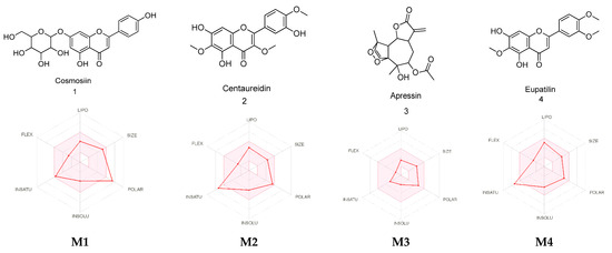 Radar diagrammatic representation of A. fragrantissima flower dichloromethane extract-derived identified metabolites (M1–M14) using SwissADME webserver. LIPO: Lipophilicity, Size: Molecular weight, POLAR: solubility, INSOLU: insolubility, INSATU: insaturation, and FLEX: flexibility. The properties involved in the colored zone are preferred for orally active drugs.