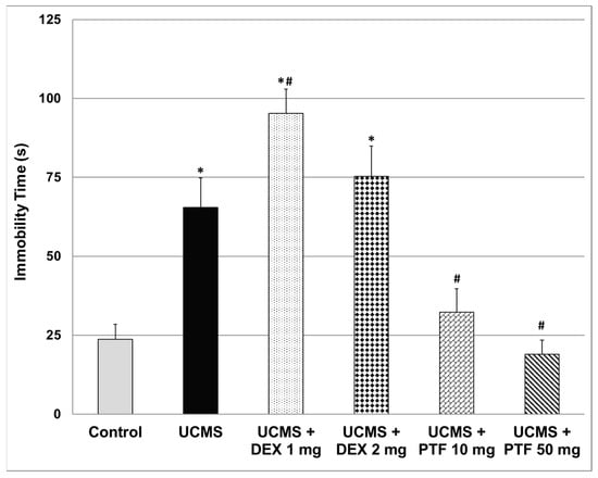 Effects of DEX and PTF on immobility time. Values are mean ± SEM of 11–12 rats in each group. One-way ANOVA test: F = 23.5, p < 0.0001; t-test: * p < 0.05 vs. control, # p < 0.05 vs. UCMS. DEX—dexamethasone, PTF—pentoxifylline, UCMS—unpredictable chronic mild stress.