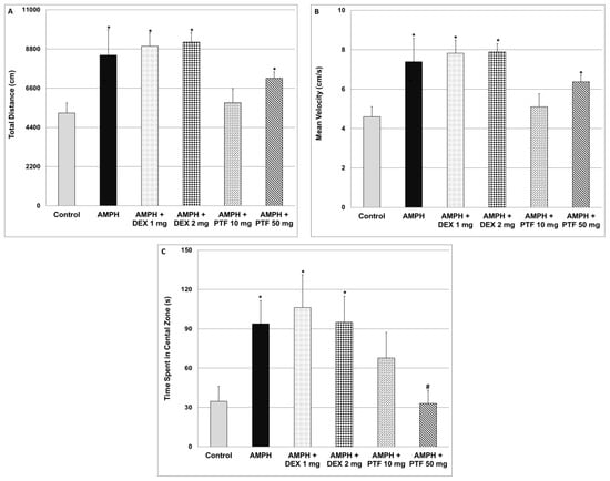 As seen in Figure 2, administration of AMPH significantly increased total distance traveled (A) and (scalar) mean velocity (B). Treatment with DEX at both doses did not affect AMPH-induced elevation in these parameters. On the other hand, treatment with PTF 10 mg/kg significantly decreased the elevation in total distance (Figure 2A) and scalar mean velocity (Figure 2B), while PTF 50 mg/kg did not have a significant effect. Furthermore, AMPH significantly increased the time spent in the central zone of the open field (Figure 2C), indicative of increased risk-taking behavior. Treatment with DEX at both doses did not alter this parameter. In contrast, administration of PTF 50 mg/kg (but not 10 mg/kg) significantly decreased the time spent in the central zone (Figure 2C), suggestive of an anti-manic-like effect from PTF.