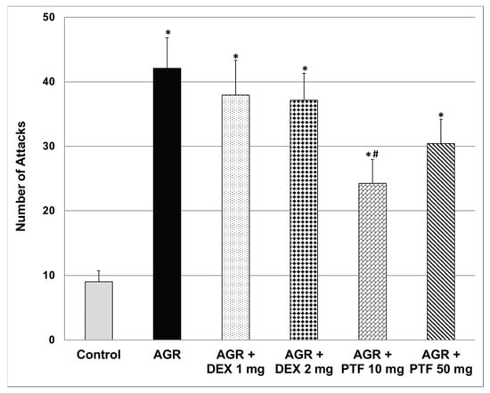 Aggressive (resident) rats executed a significantly higher number of attacks as compared to control animals (Figure 3). Pre-treatment with DEX (1 or 2 mg/kg) did not alter the aggressive behavior of resident rats. Contrastingly, 10 mg/kg PTF (but not 50 mg/kg) significantly decreased the number of attacks committed by resident rats (Figure 3).
