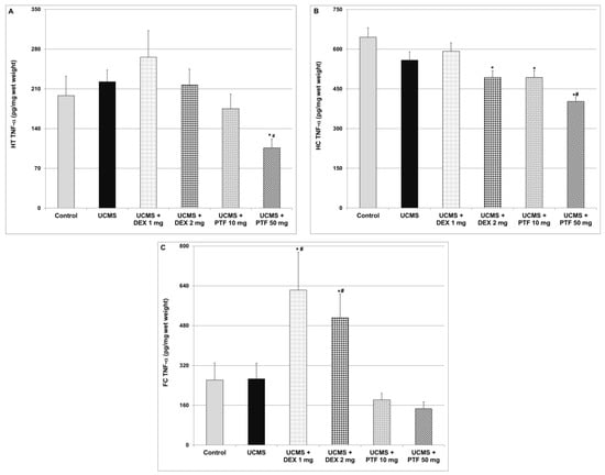 Effects of DEX and PTF on TNF-α levels in brains of UCMS rats. (A) Hypothalamus (HT), (B) hippocampus (HC) and (C) frontal cortex (FC). Values are means ± SEM of 11–12 rats in each group. (A) One-way ANOVA test: F = 3.19, p = 0.012; t-test: * p < 0.05 vs. control, # p < 0.05 vs. UCMS. (B) One-way ANOVA test: F = 11.82, p = 0.0001; t-test: * p < 0.05 vs. control, #p < 0.05 vs. UCMS. (C) One-way ANOVA test: F = 6.09, p = 0.0004; t-test: * p < 0.05 vs. control, # p < 0.05 vs. UCMS. DEX—dexamethasone, PTF—pentoxifylline, TNF—tumor necrosis factor, UCMS—unpredictable chronic mild stress.
