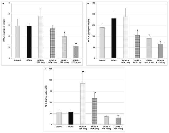 Similar to TNF-α, exposure to UCMS did not cause significant changes in IL-6 levels in the HT, HC and FC (Figure 5). As compared to UCMS (only)-subjected rats, treatment with 10 or 50 mg/kg PTF was associated with a significant decrease in IL-6 levels in the HT (Figure 5A) and HC (Figure 5B). Treatment with 50 mg/kg PTF also significantly reduced IL-6 levels in the FC (Figure 5C). Similarly, 2 mg/kg DEX significantly decreased IL-6 levels in the HC (Figure 5B). In contrast, DEX (1 and 2 mg/kg) significantly increased IL-6 levels in the FC (Figure 5C).