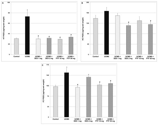 Effects of DEX and PTF on PGE2 levels in brains of UCMS rats. (A) Hypothalamus (HT), (B) hippocampus (HC) and (C) frontal cortex (FC). Values are means ± SEM of 11–12 rats in each group. (A) One-way ANOVA test: F = 12.85, p = 0.0001; t-test: * p < 0.05 vs. control, # p < 0.05 vs. UCMS. (B) One-way ANOVA test: F = 3.73, p = 0.0094; t-test: # p < 0.05 vs. UCMS. (C) One-way ANOVA test: F = 5.99, p = 0.0005; t-test: * p < 0.05 vs. control, # p < 0.05 vs. UCMS. DEX—dexamethasone, PG—prostaglandin, PTF—pentoxifylline, UCMS—unpredictable chronic mild stress.
