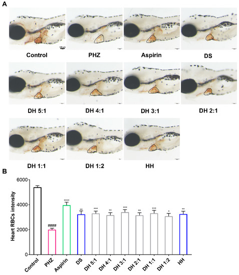 For the thrombosis model, the zebrafish embryos at the 2 dpf stage were exposed to 1.5 µM PHZ for 24 h [33]. After PHZ removal, zebrafish were cultured with DS, HH, and the DH herbal pair extracts in different proportions (50 µg/mL). The zebrafish dealt with 0.1% DMSO was used as the vehicle control, and aspirin (20 µg/mL) was a positive control. After 24 h, zebrafish from all groups were stained with 1.0 mg/mL o-dianisidine dye liquor for 15 min. The heart position of the zebrafish was observed and the image was captured with a stereomicroscope (Olympus Microsystems, Tokyo, Japan). The intensity of heart erythrocytes was quantitatively analyzed using Image-Pro Plus 6.0, and the anti-thrombotic efficacy was calculated with the following formula:
