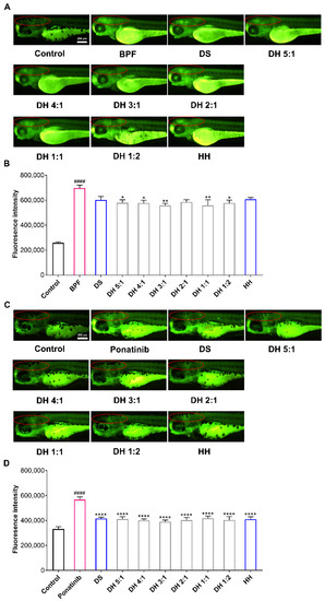The DH herbal pair improved the brain injuryof zebrafish. (A) The zebrafish neurological injury model induced by bisphenol F (BPF) (10 µg/mL) and the neuroprotective efficacy of DS, HH, and the DH herbal pair. (B) After treatment with BPF or designated drugs, the fluorescence intensity in the brains (in the red circle) of the zebrafish was quantified with the Image J software. (C) The zebrafish ischemic stroke model induced by ponatinib (1 μg/mL) and the neuroprotective efficacy of DS, HH, and the DH herbal pair. (D) After treatment with ponatinib or designated drugs, the fluorescence intensity in the brains (in the red circle) of the zebrafish was quantified with the Image J software. The data are presented as mean ± SEM (n = 10). DS: Danshen; HH: Honghua; DH: Danshen-Honghua. * p < 0.05, ** p < 0.01, **** p < 0.0001 vs. model group; #### p < 0.0001 vs. control group.