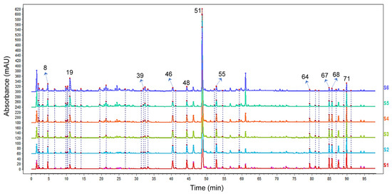 HPLC fingerprint of six proportions of the DH herbal pair. The chromatograms of S1–S6 represent the following: DH 5:1 (S1); DH 4:1 (S2); DH 3:1 (S3); DH 2:1 (S4); DH 1:1 (S5); DH 1:2 (S6).