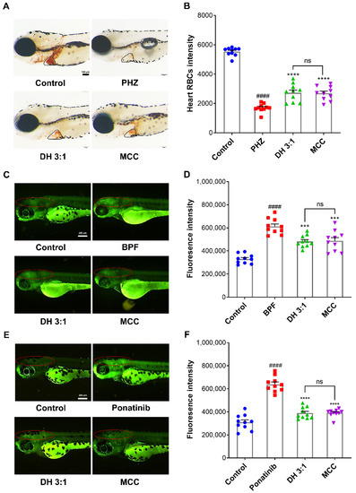 The multi-component combination (MCC) improved thrombosis and neuronal injury in zebrafish. (A,B) Zebrafish thrombosis was induced by PHZ (1.5 μM), and the antithrombotic efficacy of the DH herbal pair and MCC was evaluated by calculating the heart RBC intensity (in the black circle) with the Image Pro Plus 6.0 software. (C,D) The zebrafish neurological injury model was induced by BPF (10 µg/mL). (E,F) The zebrafish ischemic stroke model was induced by ponatinib (1 μg/mL). The neuroprotective efficacy of the DH herbal pair and MCC was analyzed by calculating the fluorescence intensity in the zebrafish brains (in the red circle) with the Image J software. The data are presented as mean ± SEM (n = 10). DH: Danshen-Honghua *** p < 0.001, **** p < 0.0001 vs. model group; #### p < 0.0001 vs. control group; ns: no significant difference.