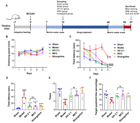 The MCC of the DH herbal pair improved cognitive impairment in VaD rats. (A) The time schedule of animal experiment protocols. (B,C) The swimming speed and the escape latency of rats from day 41 to day 45 in the Morris water maze (MWM) test were recorded. (D) The escape latency on day 45 in the MWM. (E,F) The platform crossing times and the target quadrant time percentage within 120 s were recorded on day 46 after the platform was removed. The data are presented as mean ± SEM (n = 5). DH: Danshen-Honghua; MCC: multi-component combination. * p < 0.05, ** p < 0.01, *** p < 0.001, **** p < 0.0001 vs. model group; ## p < 0.01, ### p < 0.001, #### p < 0.0001 vs. sham group; ns: no significant difference.