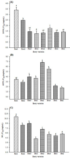 All the berry varieties studied showed an important AP with the three different methods (ABTS, DPPH, NO). The results were expressed as IC50 values that, at the lowest levels, indicate the highest free radical-scavenging activity of the samples.