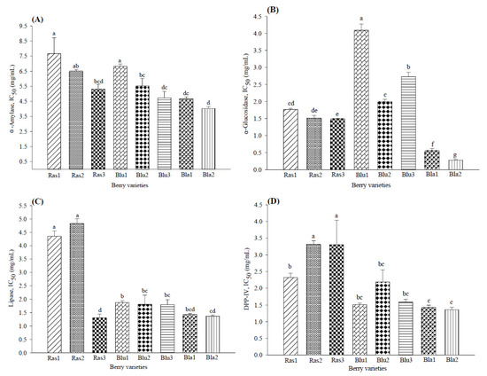 The IC50 for pancreatic lipase inhibition (Figure 2C) indicated the highest activity by blackberries (1.36 to 1.42 mg/mL), followed by the Ras3 raspberry variety (IC50 1.30 ± 0.14 mg/mL) and blueberry varieties (IC50 1.80 to 1.87 mg/mL), while the lowest activity was shown by Ras1 and Ras2 (IC50 4.35 and 4.82 mg/mL). Similarly, McDougall et al. [16] reported that a tannin-rich raspberry extract effectively inhibited pancreatic lipase activity in vitro, while blueberry caused a slight inhibition.