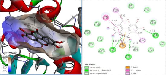 Most of the compounds showed higher activity than acarbose (−7.2 kcal/mol) to inhibit α-amylase; however, catechin (−8.9 kcal/mol) stood out for presenting the highest potential. Sui et al. [21] demonstrated that the anthocyanins peonidin-3-glucoside (−7.46 kcal/mol), cyanidin-3,5-glucoside (−7.15 kcal/mol), cyanidin-3-glucoside (−6.75 kcal/mol) and cyanidin-3-rutinoside (−6.53 kcal/mol) showed competitive inhibition against porcine pancreatic α-amylase due to its binding to the active site.
