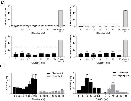 The Ames MPF 98/100 test (Xenometrix, Allschwil, Switzerland) was performed as recommended by the supplier and recently published [43]. Briefly, two Salmonella typhimurium strains TA98 and TA100 (incapable to produce histidine) were used with or without liver S9 homogenate to simulate the metabolic conversions of silvestrol with liver enzymes. After exposure to increasing concentrations of silvestrol or positive controls (2 μg/mL of 2-NF (TA98), 0.1 μg/mL of 4-NQO (TA100), 2.5 μg/mL (TA100) and 1.0 µg/mL (TA98) of 2-AA), the cultures were diluted in pH indicator medium lacking histidine and incubated for two days. Cells that had undergone reversion to amino acid prototrophy grew into colonies and bacterial metabolism reduces the pH of the medium, changing the color of that well. The number of wells containing revertant colonies were counted and compared to a negative control (DMSO). The experiment was performed once in triplicate. The Ames MPF calculation sheet provided by Xenometrix (Allschwil, Switzerland) was used for data analysis. Fold induction over the baseline was taken as the ratio of the mean number of positive wells for the dose concentration divided by the baseline. The baseline was obtained by adding one standard deviation to the mean number of positive wells of the solvent control. Compounds inducing revertant numbers above the baseline were characterized as substances with mutagenic potential.