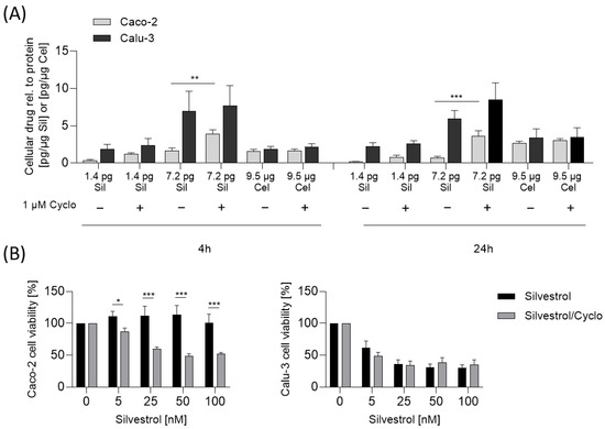 Cytotoxicity and cellular uptake of silvestrol vary in relation to P-glycoprotein levels. (A) For cellular uptake assay, Caco-2 or Calu-3 cells were preincubated with 1 µM cyclosporine to inhibit P-glycoprotein or vehicle for 60 min and subsequently incubated with various concentrations of silvestrol (5 nM, 25 nM) or 25 µM celecoxib for the indicated time points. The concentrations of the compounds were detected by LC-MS/MS. The concentration of drugs in the cells were normalized to the protein concentration. (B) For cytotoxicity, Caco-2 and Calu-3 cells were preincubated with 1 µM cyclosporine or left untreated for 60 min and subsequently incubated with increasing concentrations of silvestrol as indicated for 48 h. The viability was assessed with a formazan-based proliferation assay. The relative viability values were obtained by normalizing the values of the drug-treated samples to the control samples. The experiments were performed in biological triplicates. Data are expressed as mean ± SEM. Two-way ANOVA with Sidak’s multiple comparisons test was used for statistical analysis. * p < 0.05, ** p < 0.01, *** p < 0.001 indicate significant differences between compound and control samples (A) or Caco-2 and Calu-3 samples (B). Abb.: Cyclo, Cyclosporine.