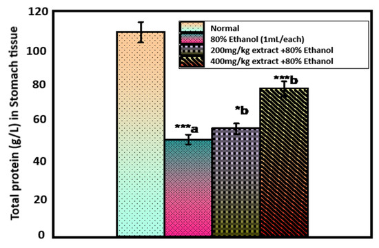 Figure 4 shows the total protein (TP) level in gastric juice. The level of TP in the gastric juice of control rats was 108.57 ± 2.36 g/L gastric juice, which decreased significantly to 51.49 ± 1.82 g/L (p < 0.001) after administration of 80% ethanol. Pretreatment of rats with an extract of O. forsskalii at both doses (200 and 400 mg/kg) significantly increased the ethanol-induced decrease in TP (57.48 ± 1.38, p < 0.05; 78.63 ± 2.08 g/L, p < 0.001). Proteins play a key role in maintaining gastric integrity [62]. A significant decrease was observed in TP after ethanol administration, indicating malnutrition and disorders affecting the gastrointestinal system and interfering with the normal absorption of nutrients [63]. Our results are consistent with previous reports showing TP in ethanol-induced gastric lesions [64]. Treatment of rats with an extract of O. forsskalii resulted in a significant increase in TP. Our observations suggest that TP plays a role in protecting gastric mucosa by extracting O. forsskalii.