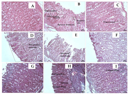 (A–C), Hematoxylin and eosin (H&E, magnification is ×400, scale bar is 20 µ) stain, where (A) is the standard stomach sample that displays a typical appearance of stomach tissue; (B) is an 80% ethanol stomach sample showing the toxic effects, which are indicated by loss of the ability for secretion and presence of vacuolation in the cytoplasm, necrosis, degeneration, dysplastic cells, basement membrane and atrophic mucosa detachment, and reduction in gland size or even absence of gland structure; (C) is 400 mg/kg O. forsskalii extract and 80% ethanol stomach sample showing considerable improvement and restoration of the secreting stomach microanatomical architecture. However, some glands suffer from the remaining effects of degeneration and atrophy of the stomach’s mucosa. (D–F) Periodic acid Schiff (PAS, magnification is ×400, scale bar is 20 µ) stain, where (D) is a normal stomach sample showing the high activity of mucosa in production. The presence of PAS-positive materials that exhibit a dark magenta color, especially towards the lumen, which is in the left half of this photomicrograph and basement membranes are intact for each gland; (E) is the 80% ethanol stomach sample showing a severe reduction and the absence of the mucosal activity of production of PAS-positive materials. Basement membranes also exhibit damage and weakness in multiple areas; (F) is 400 mg/kg O. forsskalii extract, and the 80% ethanol stomach sample exhibits considerable improvement in the inability of stomach gland cells to secrete PAS-positive materials, and the basement membrane also improved. (G–I) Mason trichrome (magnification is ×400, scale bar is 20 µ) stain, where (G) is a normal stomach sample showing a normal distribution of connective tissue; (H) is the 80% ethanol stomach sample: this group shows massive fibrosis due to the accumulation of collagen fibers in the submucosa and infiltration of collagen fibers into mucosa; (I) is 400 mg/kg O. forsskalii extract and 80% ethanol stomach sample, exhibiting considerable improvement and the presence of a few areas of collagen fiber infiltrates into the mucosa.