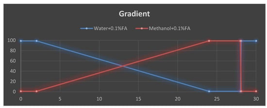 Gradient elution profile used for the LC-MS separation, decreasing order of mobile phase (water and 0.1% formic acid), increasing order of mobile phase (methanol and 0.1% formic acid).