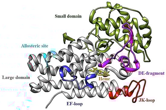 Structure of indoleamine deoxygenase 1 (IDO1) with highlighted regions: minor domain (green) and major domain (grey, magenta, red, blue, and cyan). Contained in the larger domain are: the DE fragment, composed of the DE hairpin and the DE loop; JK loop; EF loop; the heme cofactor (orange); the allosteric site.