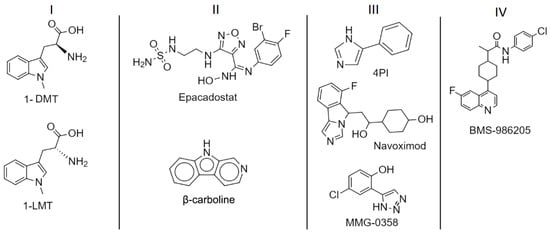 Type I inhibitors are classified as competitive inhibitors of tryptophan. In general, type I inhibitors target the molecular oxygen-bound holo-IDO1 form and do not form a direct bond with heme iron [17]. The 1-LMT and 1-DMT are classified within this category of inhibitors [20].
