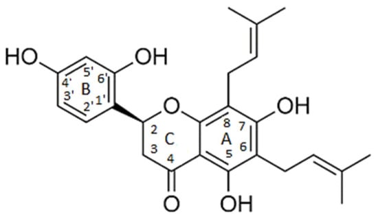 Dichamanetin is a C-benzylated flavanone that can be obtained from several Southeast Asian plant species, such as the following: Uvaria alba, Uvaria chamae, Piper sarmentosum, and Xylopia pierrei [28,29,30]. Isochamanetin, another C-benzylated flavanone, was obtained from several plant species such as Sphaeranthus amaranthoides, Xylopia pierrei, and Ulvaria chamae [28,31,32]. Chamaejasmin B is a dimeric biflavonoid formed by two isosacuranetin subunits linked by C3-C3 carbons, and obtained from Southwest Asian plant species, such as Stellera chamaejasme L. [33].