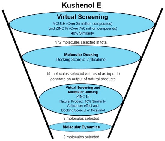 In order to identify potential IDO1 inhibitors capable of interacting with its allosteric site, the following two virtual screening tools were used: the Mcule platform [25] and the ZINC 15 database [26]. At this stage of the work, the flavonoid Kushenol E (Figure 5) was used as the reference compound, due to its proven effectiveness as a non-competitive inhibitor that binds to the allosteric site of the enzyme [24]. Tanimoto’s coefficient was used as the sampling criterium [27], and 172 compounds were sampled.