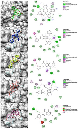 Phe185, an aromatic residue (Figure 9), interacts with flavonoids through pi-pi and pi-pi/T stacking, and van der Waals interactions [35], which are very important for the stabilization of the structural energy of protein complexes with flavonoids.