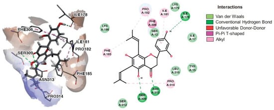 Pro182 interacts through pi interactions or with the A ring of flavanones or with phenolic groups attached to the same ring. It is known that the proline ring faces are partially positively charged [34]. As shown in Figure 8, hydrogens adjacent to the carbonyl and nitrogen of the amide (Hα and Hδ, respectively) are the most partially positive. The proline side chain is also conformationally restricted, allowing interaction with aromatic residues with minimal entropic or steric penalty [34].