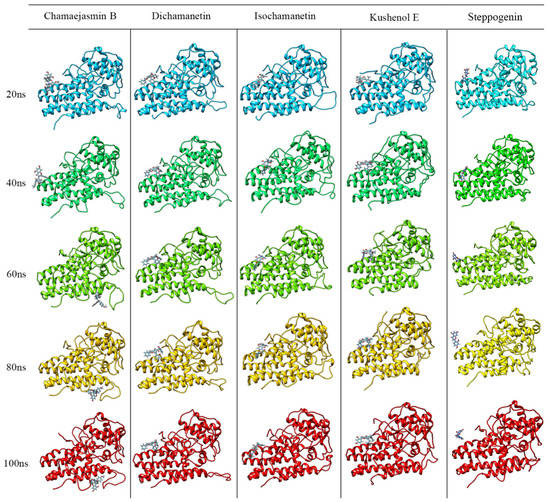 Three-dimensional structures of the IDO1-flavonoid complexes at 20 ns, 40 ns, 60 ns, 80 ns, and 100 ns are shown in Figure 11. With the exception of chamaejasmin B, which detaches from the allosteric site cavity after 40 ns, all other flavonoids remained docked. Interestingly, after detaching from the allosteric site, chamaejasmin B stabilizes next to the JK loop. Furthermore, only one of the isosacuranetin subunits interacts with the allosteric site, while the other subunit is exposed to the solvent. Moreover, Figure 11 also shows that after 80 ns, steppogenin is almost completely detached from the allosteric site.