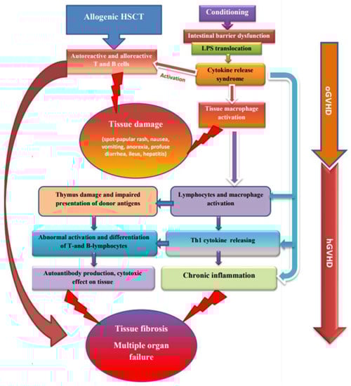 Hematopoietic stem cell transplantation (HSCT) is a method of radical treatment of a wide spectrum of malignant and non-malignant diseases, both in children and in adults [1]. One of the most frequent complications of allogenic HSCT is graft-versus-host disease (GVHD) [2]. GVHD is a serious limitation to the success of aHSCT, occurring in donor-derived immune cells in bone marrow or stem cell, where the graft recognizes the transplant recipient as foreign, which results in a negative immune response, starting with tissue damage with subsequently damage to organs and systems, which can lead to death [2,3] (Figure 1). There are two main types of GVHD, called acute graft-versus-host disease (aGVHD) and chronic GVHD (cGVHD), with different clinical manifestations, time of onset, and treatment strategies. Traditional aGVHD, with spotty-papular rash, sickness, emesis, anorexia, profuse diarrhea, enteric obstruction, and cholestatic hepatitis, occurs within 100 days after transplantation.