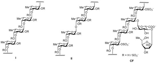 Two types of homofucose backbone chains in brown seaweed fucoidans (R depicts the places of potential attachment of carbohydrate substituents, sulfate, and acetyl groups) and the structure of fucoidan CF from C. flagelliformis seaweed.
