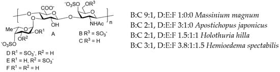 - Ustyuzhanina, N.E.; Bilan, M.I.; Dmitrenok, A.S.; Tsvetkova, E.A.; Shashkov, A.S.; Stonik, V.A.; Nifantiev, N.E.; Usov, A.I. Structural characterization of fucosylated chondroitin sulfates from sea cucumbers Apostichopus japonicus and Actinopyga mauritiana. Carbohydr. Polym. 2016, 153, 399–405. [Google Scholar] [CrossRef] [PubMed]