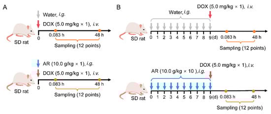 Schematic of animal experiments. (A) Mice received 5.0 mg/kg DOX via the tail vein after a single dose of 10 g/kg AR administration. (B) Mice received 5.0 mg/kg DOX via the tail vein after 10 days pre-treatment with AR (10 g/kg/d). DOX: doxorubicin, AR: Astragali Radix.