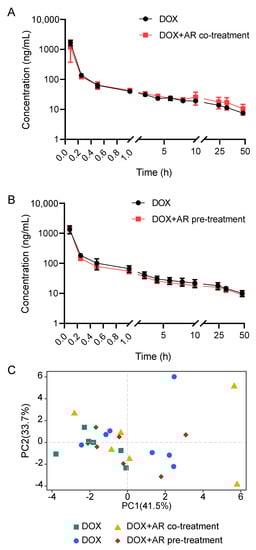The current LC-MS/MS method was successfully applied for investigating the plasma pharmacokinetics and tissue distribution of DOX in rats after co-treatment with single-dose AR or pre-treatment with multiple-dose AR (Figure 1). The mean plasma concentration–time curves of DOX are shown in Figure 2A,B, and all 14 pharmacokinetic parameters are summarized in Table 3. For the two isotype control groups that received only DOX, the pharmacokinetic parameters of the maximum experimental concentration (Cmax), the total area under the concentration–time curve (AUC0-t), and the half-life (t1/2) were in the range of 838.4 ng/mL to 2157.8 ng/mL, 1054.7 µg/L*h to 1940.1 µg/L*h, and 25.0 h to 39.3 h, respectively. These results were consistent with previously reported animal experiment data [19,20]. Compared with the DOX groups, we found no significant differences in all pharmacokinetic parameters (e.g., Cmax, AUC0-t, t1/2, and MRT) after AR co- or pre-treatment. Furthermore, we explored the variation patterns of these 14 pharmacokinetic parameters among the four groups of rats using principal component analysis (PCA). As illustrated in Figure 2C, no clear separation is observed between the four groups, although there are two discrete samples. These results indicate that AR co- or pre-treatment could not change the drug disposition of DOX in vivo.