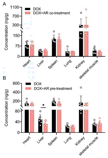 At 48 h after injection, DOX concentrations in various tissues, namely heart, liver, lung, kidney, spleen, and skeletal muscle, were detected at levels above the LOQ. Extensive distribution was seen in some organs, such as the kidney, spleen, and heart, whereas relatively low levels were detected in the lung and skeletal muscle (Supplementary Table S3), which was in accordance with the known disposition property of DOX [21]. As seen in Figure 3, the concentrations of DOX in these tissues were not affected by the co-treatment with a single dose of AR. In contrast, the pre-treatment with multiple doses of AR reduced DOX tissue exposure but only showed statistical significance (p < 0.05) in the liver. These data suggest that the short-term (≤10 d) administration of AR appears not to change the tissue distribution of DOX.
