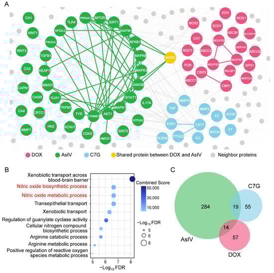 Network-based relationship between Astragali Radix (AR) components and doxorubicin (DOX) disposition. (A) A subnetwork of the protein–protein interactome illustrating the network-based separation between DOX, Astragaloside IV (ASIV), and calycosin-7-O-glucoside (C7G). (B) Top 10 enriched pathways related to DOX disposition. (C) Venn diagram showing little overlap between significantly (FDR < 0.01) enriched pathways of DOX, ASIV, and C7G.
