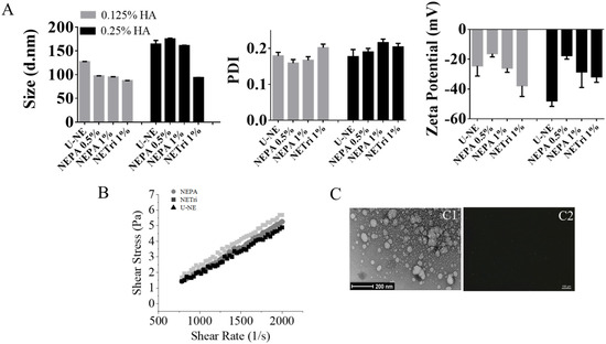Nanoemulsion development and characterization. (A) Influence of NE composition (unloaded, containing perillyl alcohol or tributyrin) and HA concentration on the size distribution, polydispersity index (PDI), and zeta potential. (B) Rheological behavior of U−NE (NE containing only tricaprylin as oil phase and 0.25% HA), NEPA (NE containing tricaprylin with 0.5% PA and 0.25% of HA), and NETri (tricaprylin with 1% tributyrin and 0.25% HA). (C) Microscopy images of NETri. (C1) Representative image of transmission electron microscopy of NETri. (C2) Representative image of polarized light optical microscopy of the formulation. At least three batches of each formulation were produced.