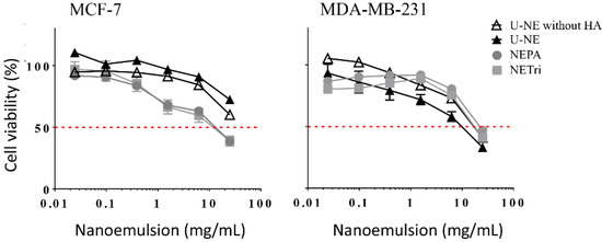 Because the choice of components influences drug delivery and cytotoxicity [44,94], the effect of nanoemulsion composition and drug incorporation on the viability of two breast cancer cell lines (MCF-7 and MDA-MB-231, ATCC, Manassas, VA, USA) was studied.