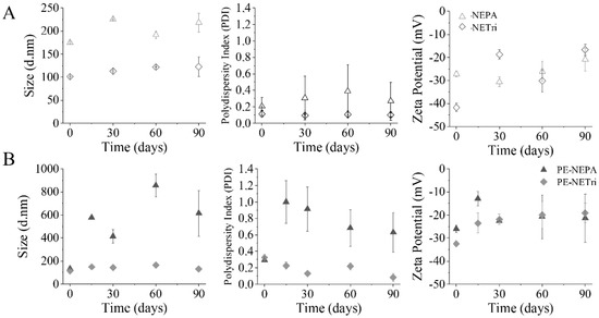 Nanoemulsion short-term stability. (A) Influence of NE composition (NEPA and NETri) on size distribution, polydispersity index (PDI) and zeta potential for 90 days. (B) Influence of NE loading with paclitaxel and elacridar (PE−NEPA and PE−NETri) on size distribution, polydispersity index (PDI) and zeta potential for 90 days. At least three batches of each formulation were analyzed.