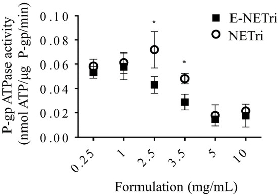 Influence of NE concentration on verapamil-induced P-gp ATPase activity. Sidak’s statistical test showed significant difference between E-NETri compared to NETri (* p < 0.05) at 2.5 and 3.5 mg/mL. Data represented as the mean ± SD, of 3–5 samples.