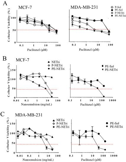 Paclitaxel incorporation in NETri improved its cytotoxicity. Paclitaxel is considered an effective chemotherapeutic drug, employed as cornerstone in early or advanced breast cancer treatment despite its many toxic effects, and thus, nanocarriers have been frequently studied to improve cytotoxicity and cancer cell targeting. For example, Bernabeu and collaborators reported that paclitaxel incorporation in nanoparticles functionalized with TPGS-b-PCL reduced its IC50 more than 60% [60]. Pepe et al. reported a 2-fold reduction on the IC50 value in basal cell carcinoma cells when the drug was incorporated in a microemulsion [59]. Carvalho et al. demonstrated that paclitaxel incorporation in a nanoemulsion reduced its IC50 by 4-fold in SK-MEL-19 cell [16]. A study by Bu and collaborators also showed that a nanoemulsion based on TPGS, Tween 80, and medium chain triglyceride reduced the IC50 in MCF-7/ADR cells by 18.9-fold compared to the drug solution [70]. The cytotoxicity enhancement mediated by nanoemulsified carriers has been associated with an improved solubilization of lipophilic drugs in the culture medium and delivery to cells and tissues [16,71]. The improved delivery might be attributed to more efficient passive diffusion—due to the presence of surfactants and other penetration enhancers as nanoemulsion components—and/or specialized mechanisms [72,73]. Previous studies suggest that phosphatidylcholine and surfactants (such as polysorbates) might act as absorption enhancers, altering the organization and permeability of biological barriers and improving drug diffusion across them [72,74,75,76]. Presence of polysorbates and poloxamers in nanocarriers has been suggested to induce endocytosis across the blood–brain barrier due to association with lipoproteins and other biological molecules [77].