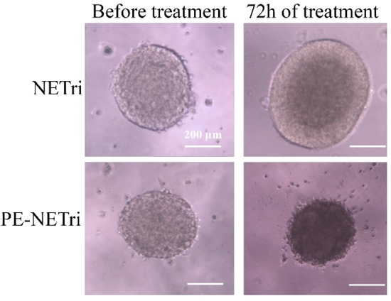 MDA-MB-231 spheroids observed before and after treatment for 72 h with the unloaded NETri or PE-NETri at the IC50 value of PE-NETri.