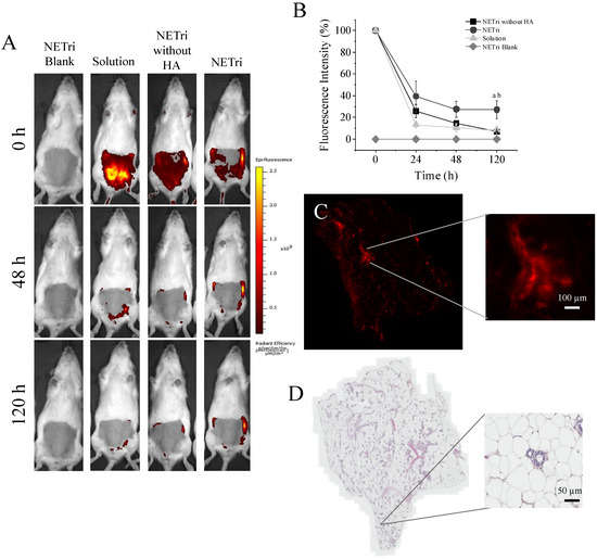 The retention of rhodamine in the mammary tissue was monitored for 120 h. The unloaded (rhodamine-free) NETri did not result in any fluorescent staining, demonstrating that signals arise from the presence of rhodamine in the tissue (Figure 7). Intraductal administration of rhodamine solution, rhodamine-loaded NETri (that contains HA), or rhodamine-loaded nanoemulsion without HA led to fluorescent staining of the mammary tissue at the day of injection. Independent of the type of treatment, staining was reduced during 5 days, but reduction was more pronounced using the solution than NETri (Figure 7A). More specifically, staining was reduced to 35 and 10% of the initial intensity using rhodamine-loaded NETri and rhodamine solution, respectively, resulting in over three-fold higher staining signal using NETri (p < 0.05) at 120 h (Figure 7B). These results suggest the benefit of associating intraductal delivery and bioadhesive nanoemulsions to prolong mammary retention. Interestingly, staining resulting from administration of NETri without HA was similar to the solution of the fluorochrome (p > 0.05, Two-way ANOVA and post hoc Tuckey) and inferior to NETri (that contains HA at 0.25%), reinforcing the role of HA to improve tissue retention and its importance in the formulation.